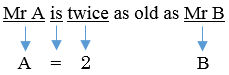 Remember that you just need to multiply twice with the variable (i.e. person), which come after the second as. For instance, have a look at the sentence: “Mr A is twice as old as Mr B”. Notice that Mr B comes after the second as, so we should multiply twice (i.e. 2) with B and equate this to A. i.e. A = 2B