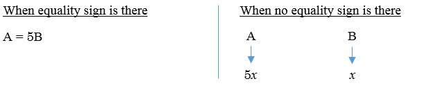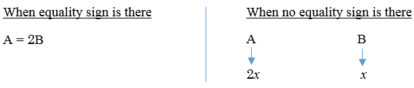On other hand, when writing statement without equation (i.e. when no equality sign is there), suppose age of B as x and hence age of A will become 2x (because A is twice of B by age).