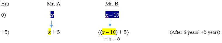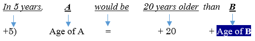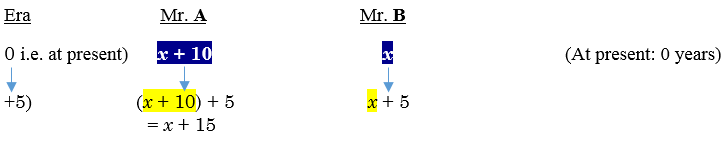 Step 5: After coming to present Era, it’s now easy to go to future Era accordingly as the question states in second part. Again, never forget to change the ages of A and B accordingly (i.e. add 5 years to the present ages of each person to go from present Era to 5 years in future), e.g.: