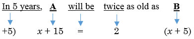 Notice that, in 5 years, age of A will be x + 15, while that of B will become x + 5. Now, question states that “In 5 years, A will be twice as old as B”, and at this stage, we always make an equation as follows:
